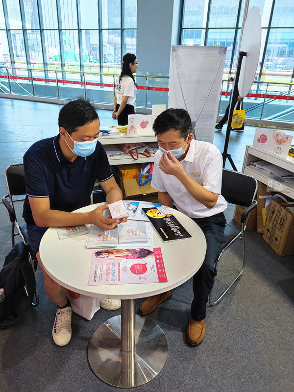 上圖:東信醫(yī)藥科技大健康研發(fā)總監(jiān)劉文富和客戶交流