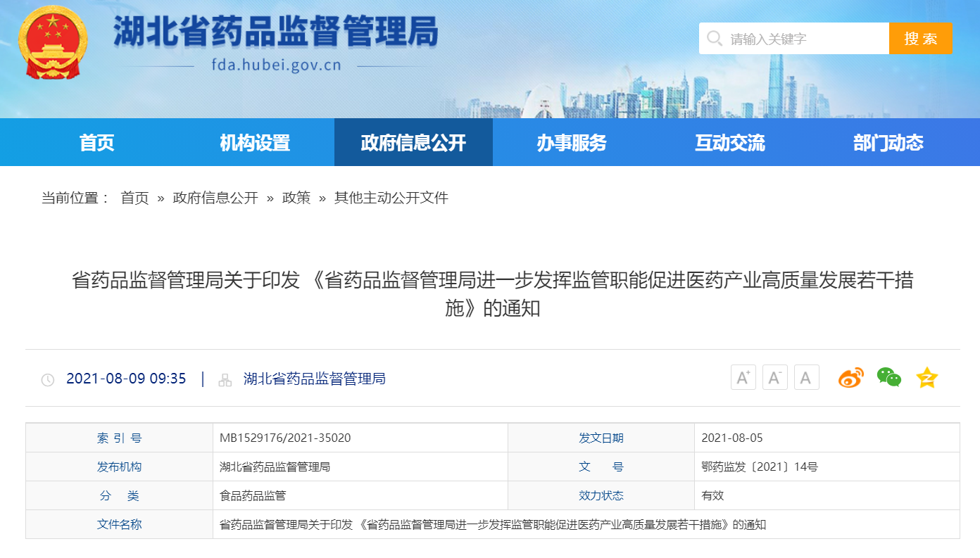 8月5日,湖北省藥監(jiān)局官網(wǎng)發(fā)布關(guān)于印發(fā) 《省藥品監(jiān)督管理局進(jìn)一步發(fā)揮監(jiān)管職能促進(jìn)醫(yī)藥產(chǎn)業(yè)高質(zhì)量發(fā)展若干措施》的通知,出臺26項(xiàng)措施推動湖北省醫(yī)藥產(chǎn)業(yè)高質(zhì)量發(fā)展。
